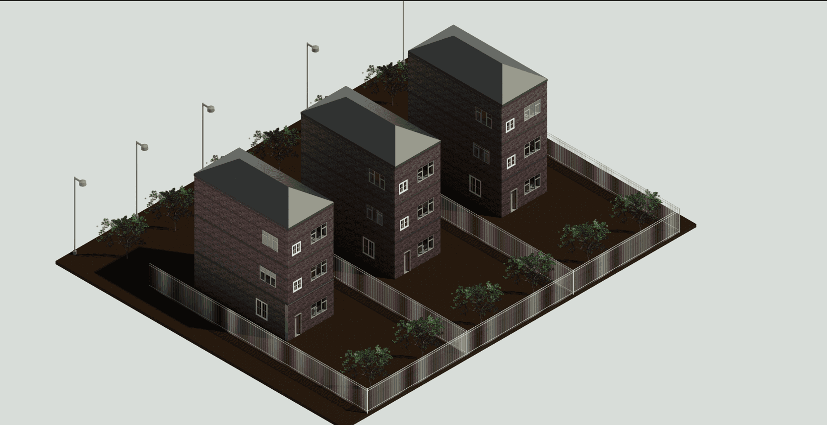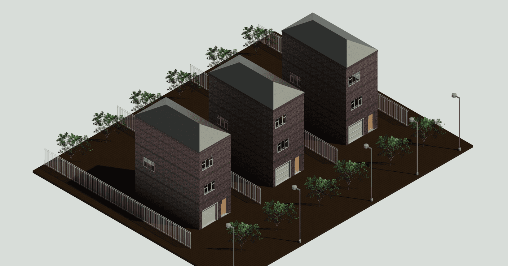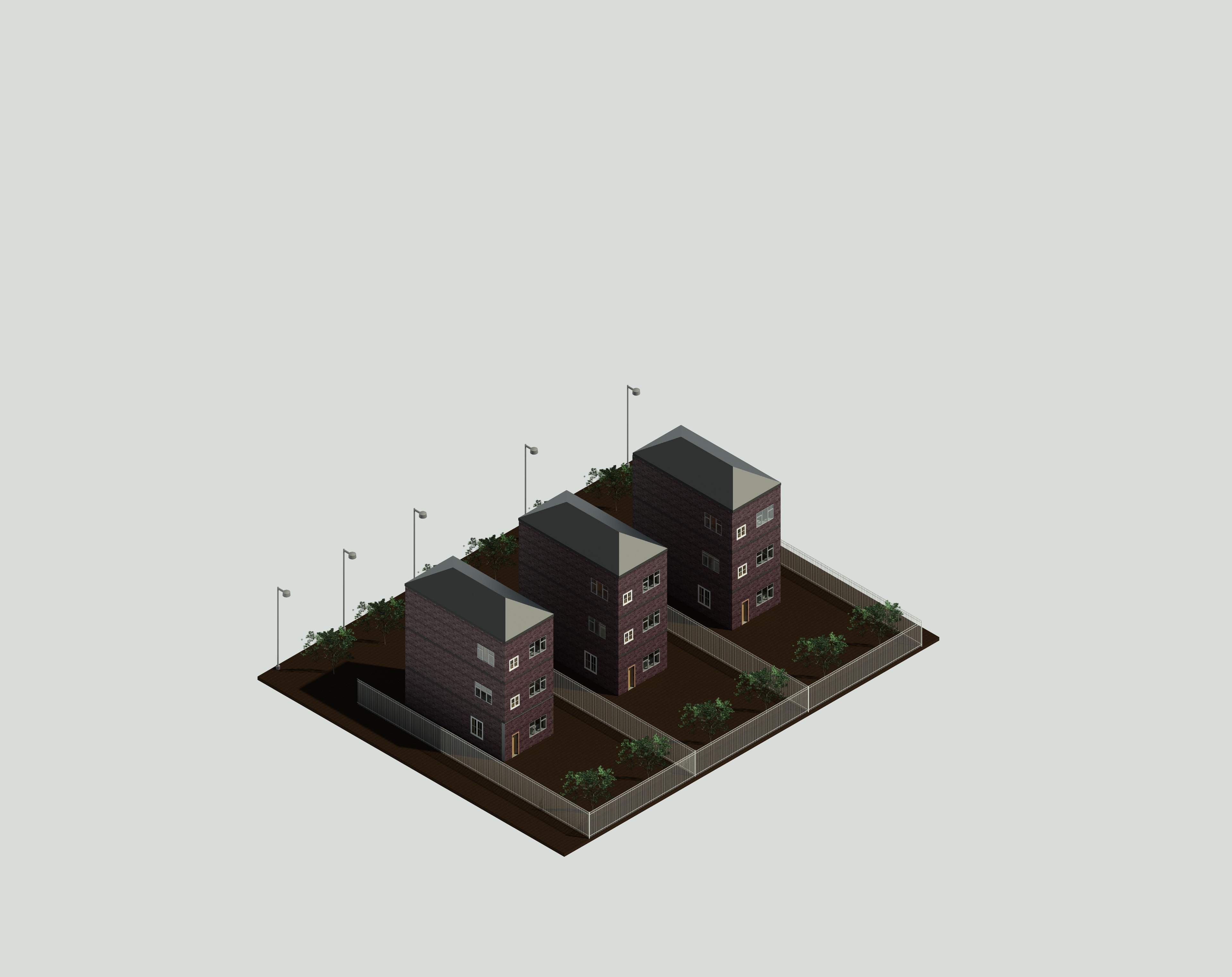 The project comprises three multi-level family housing units arranged in a compact linear layout. Each unit has a private entrance and is designed to provide comfortable, functional living spaces. The contemporary design, landscaping, boundary fencing, and external lighting enhance privacy, safety, and residential amenity while integrating well with the surrounding neighborhood.